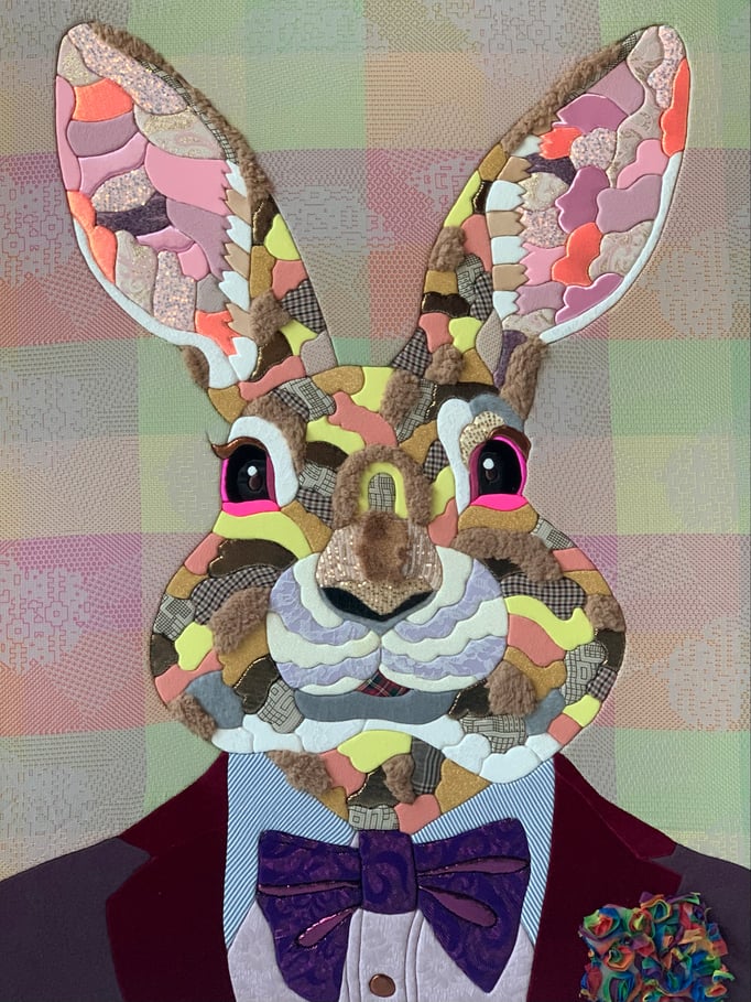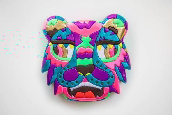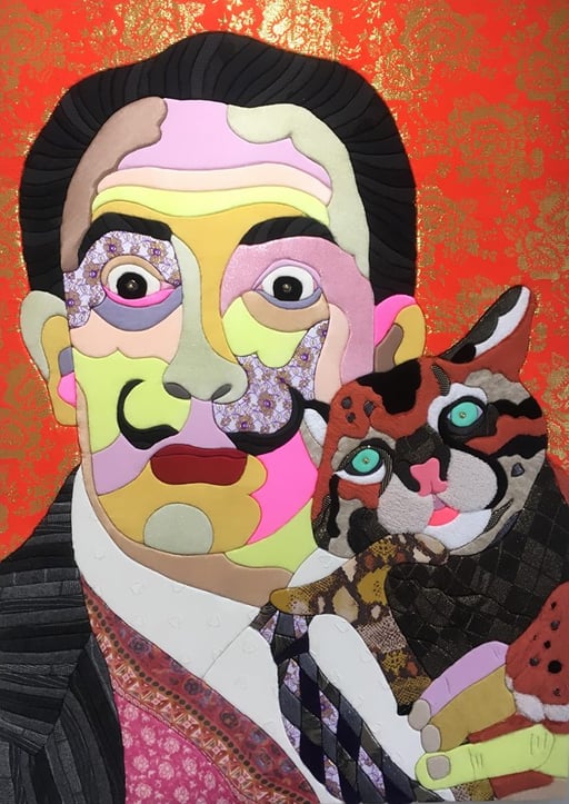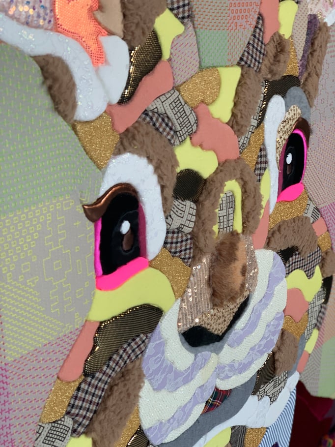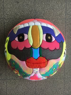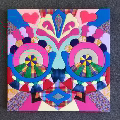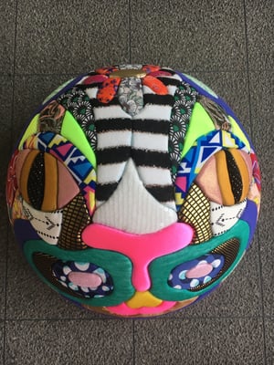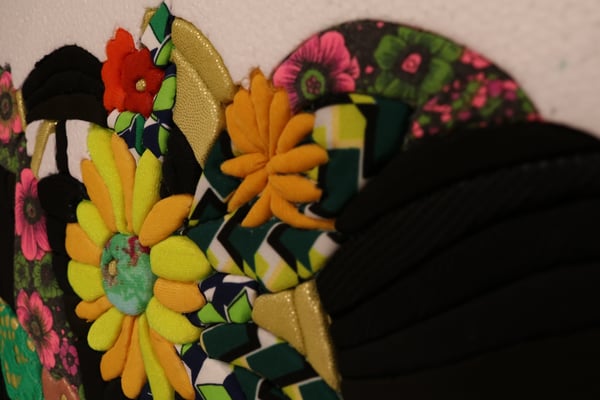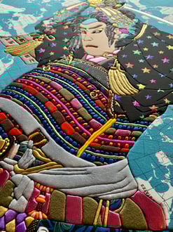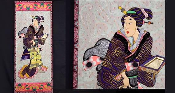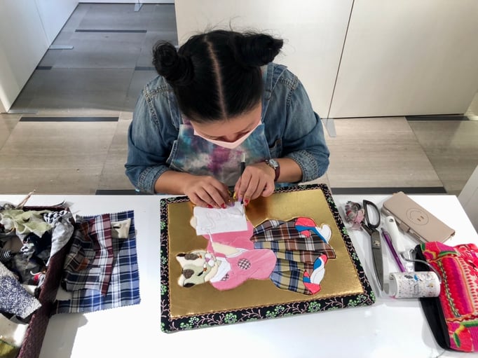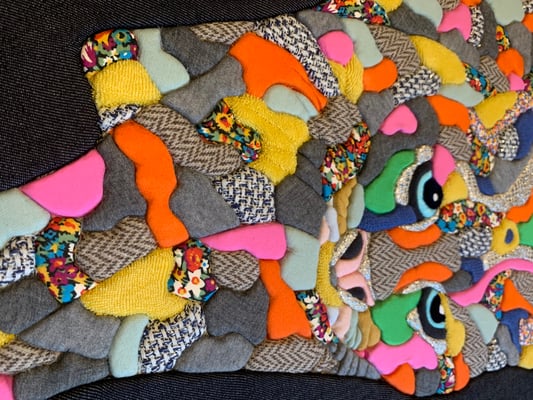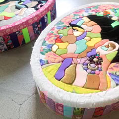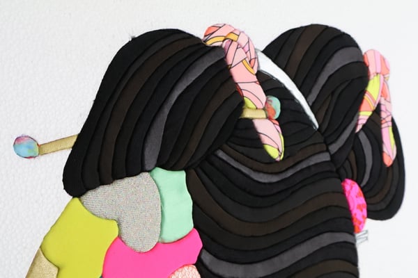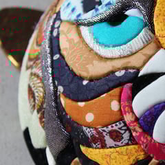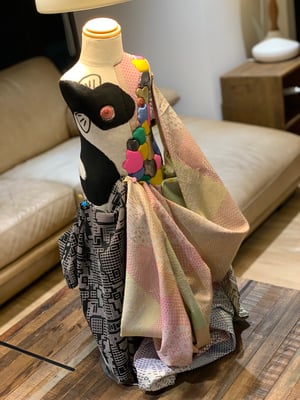 日本の伝統工芸である木目込人形の技法を取り入れながら、様々な文様のファブリックを大胆に組み合わせ、