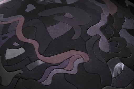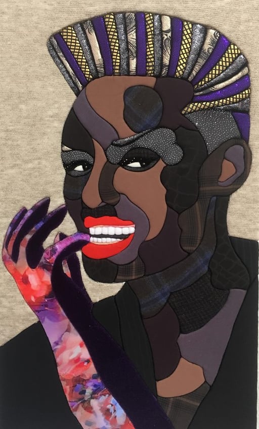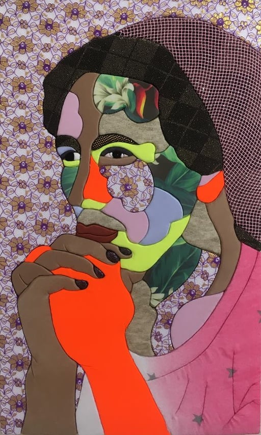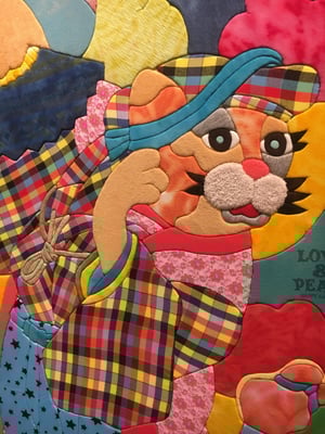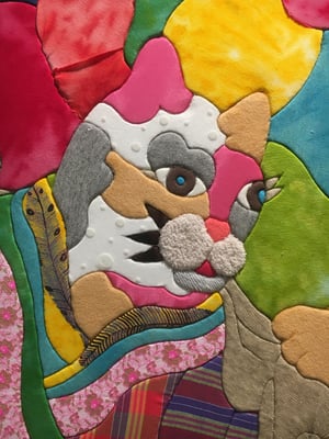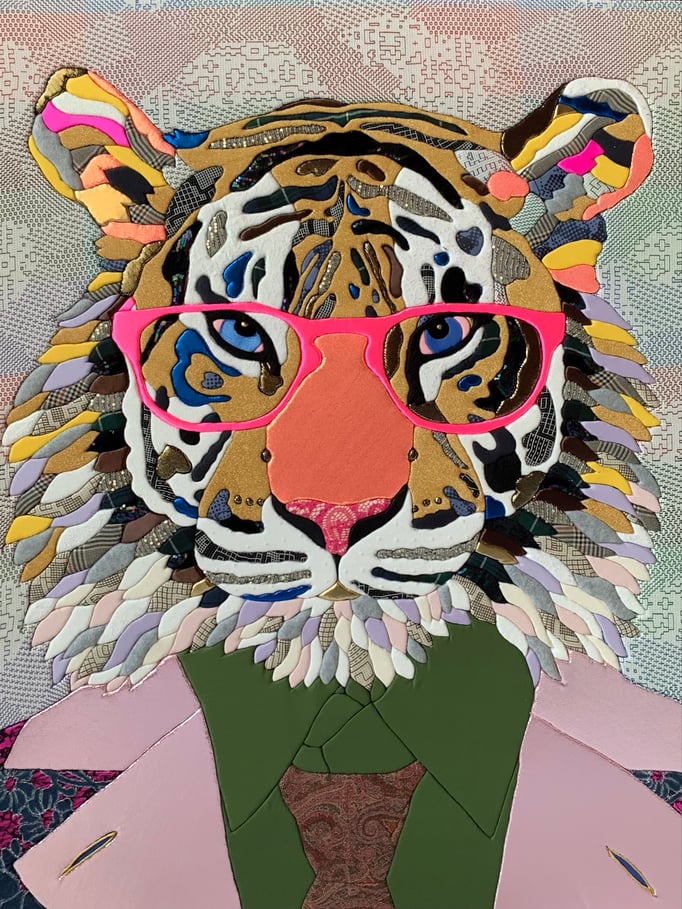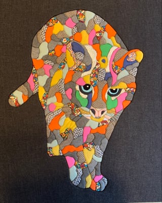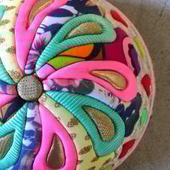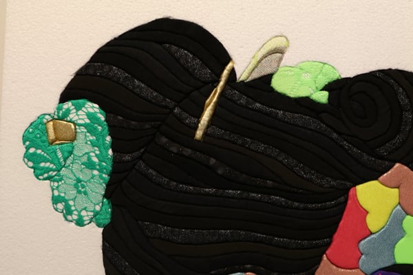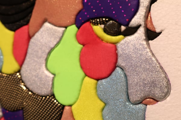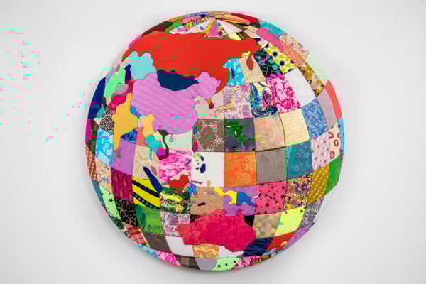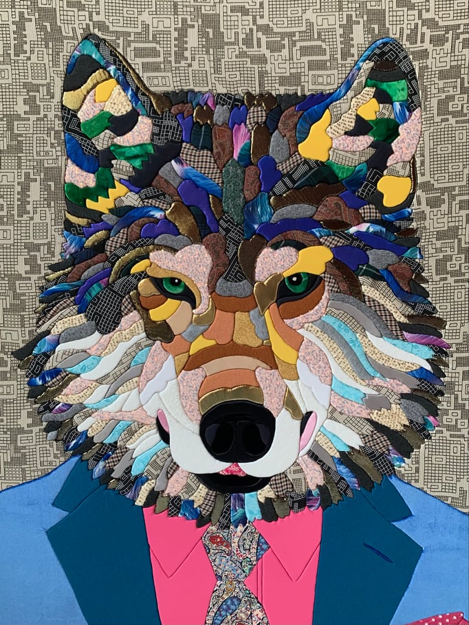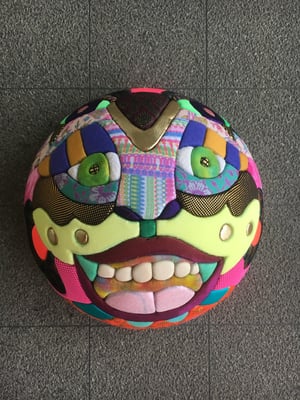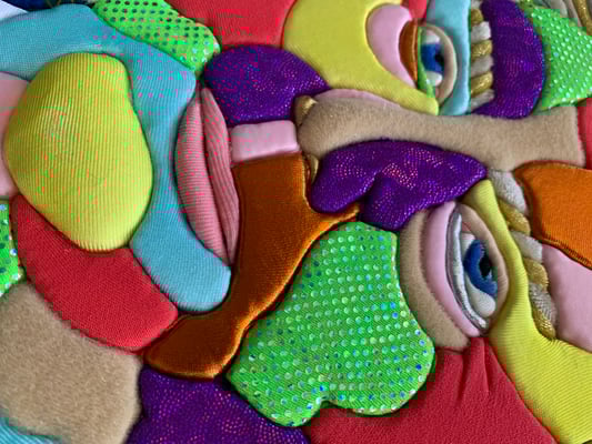 日本の伝統工芸である木目込人形の技法を取り入れながら、様々な文様のファブリックを大胆に組み合わせ、