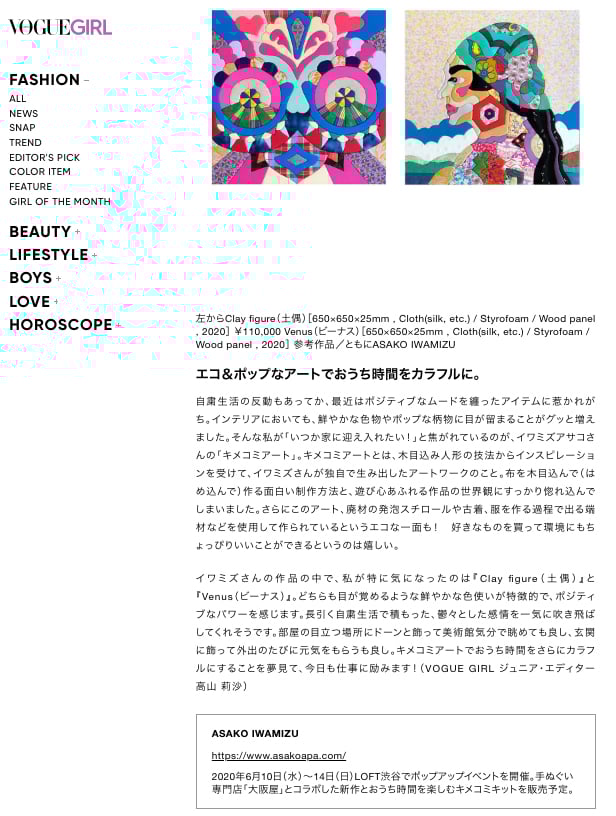 Active as an artist since 2008, Asako Iwamizu's works often incorporate vibrant colors,eliciting a sense of joy to those who come across her paintings.
