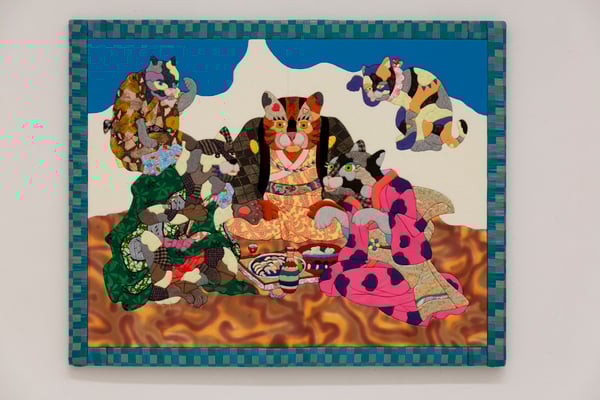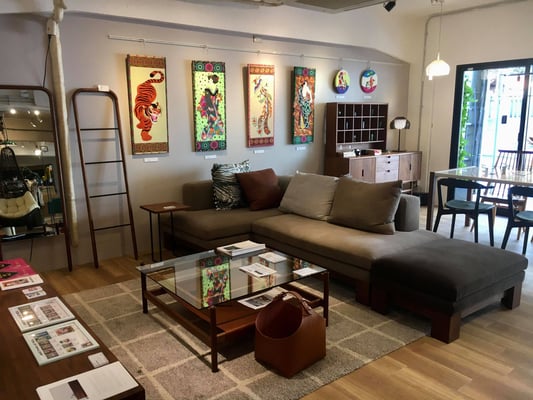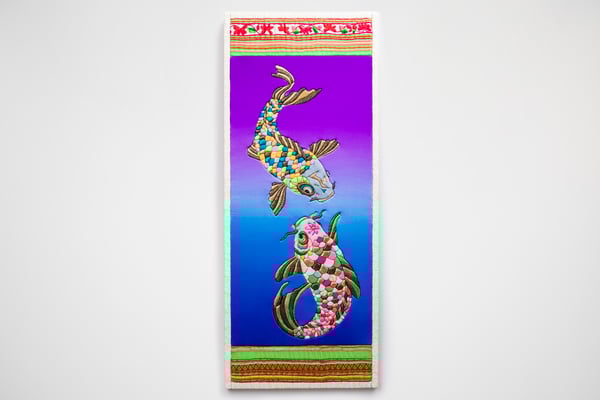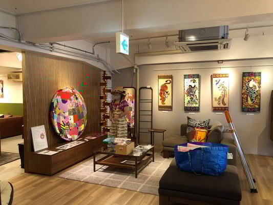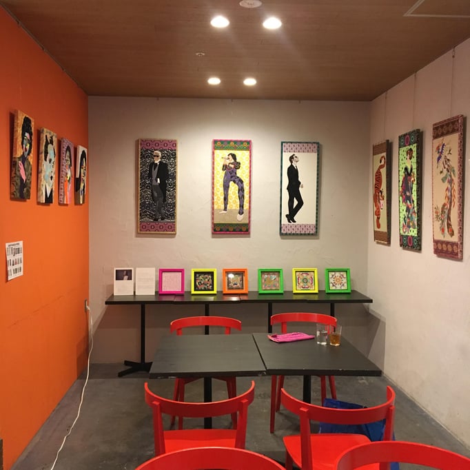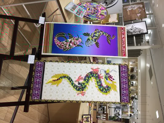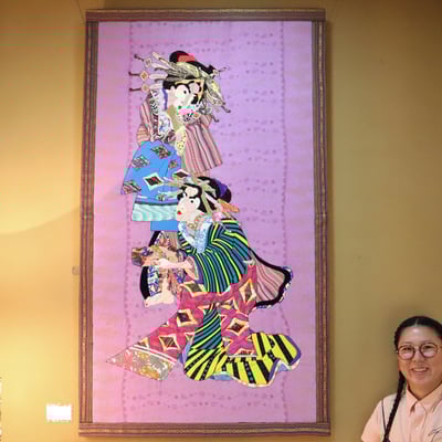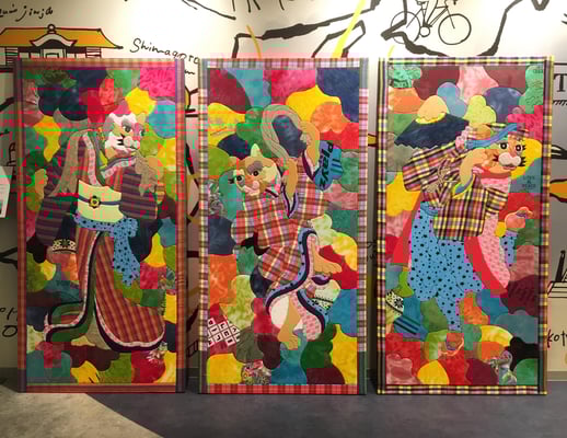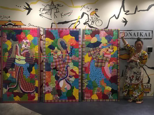 今回の展示では、日本の古典的なモチーフを様々な生地を利用してポップに仕上げたモダンな作品から、