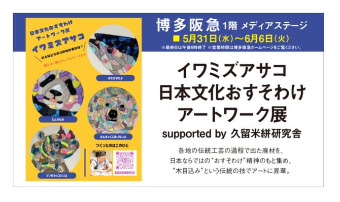 今回の博多阪急で開催されるの個展では、伝統工芸品で日本三大絣の一つであり、地元福岡の久留米絣の生地を利用した作品を発表します。
