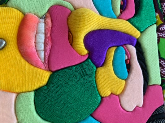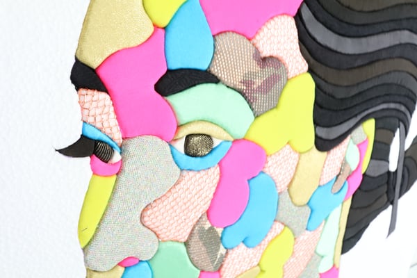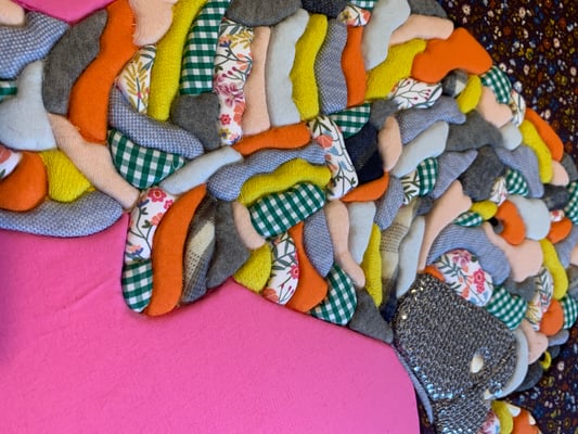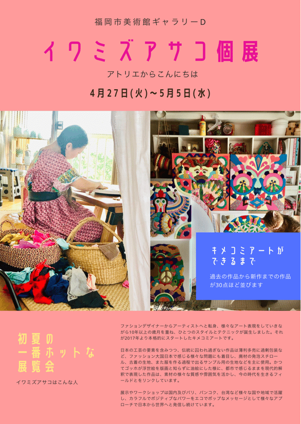 イワミズアサコは、ファッション大国日本で感じる過剰包装やファストファッションなどさまざまな問題に着目し、古着 や廃材などを材料として積極的に使用した作品を制作し発表しています。 今回は、好評だった過去2回の開催時に作品を見た沢山の方が疑問に思っている、気になるキメコミアートの作り方を作 品の材料である様々な生地と生地に関する物語をレクチャー致します。