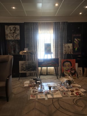 個展会場にて撮影しました。キメコミアートについて熱く語っています。